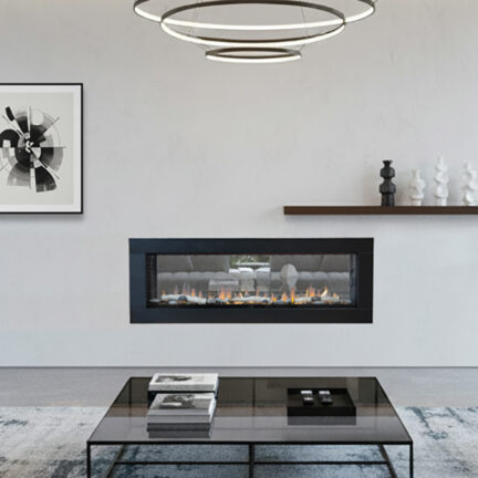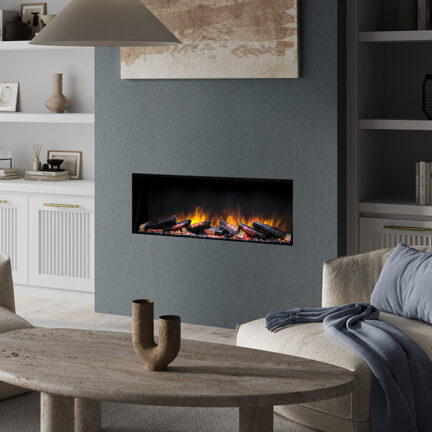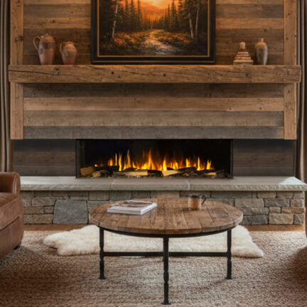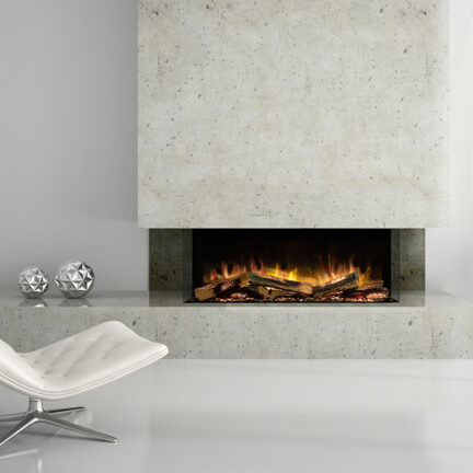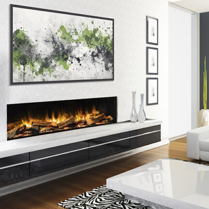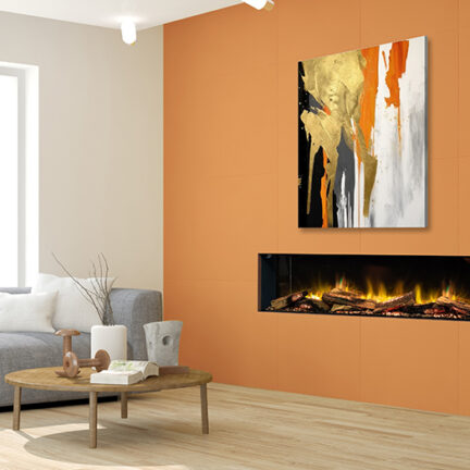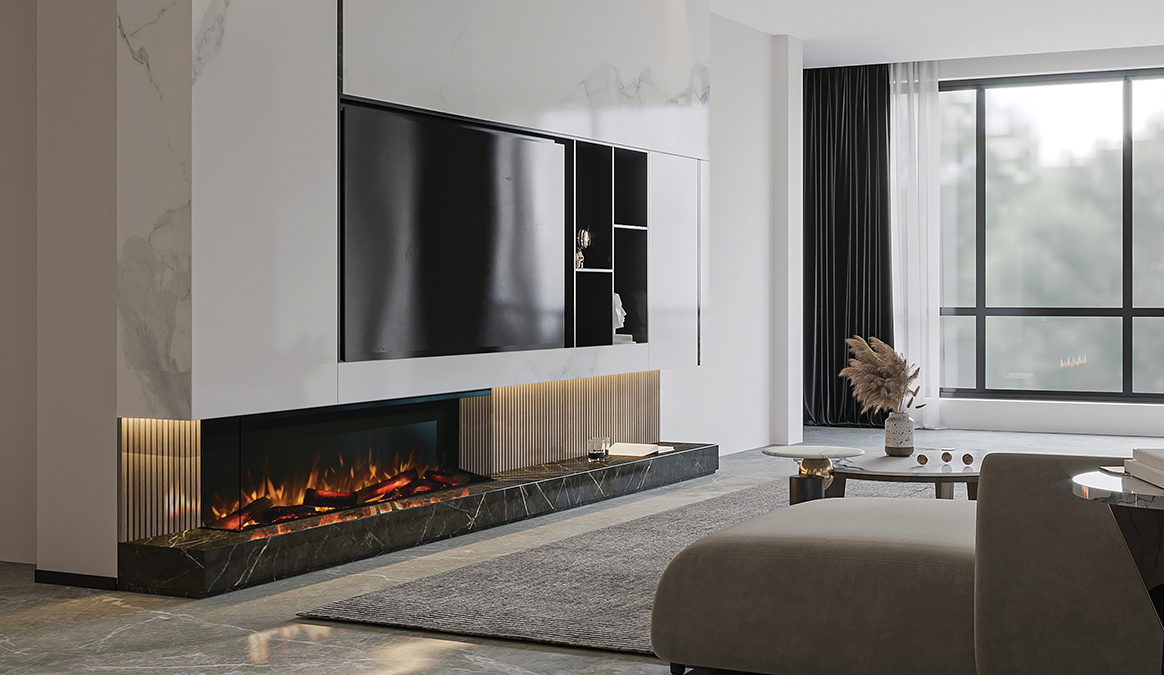 Empty modern white living room with white low cabinets and decoration on the herringbone hardwood floor in front of empty design-shaped white painted hardwood wall with copy space, a nice modern fireplace in the middle. A shelf above the fireplace with a lot of small candles, on the right 3 small hanging macrame potted plants, photo frames, and a potted lilly flower on the cabinet. Large windows, covered with long curtains in the room behind, are seen through an opened door on a side. A slight vintage effect was added. 3D rendered image.
